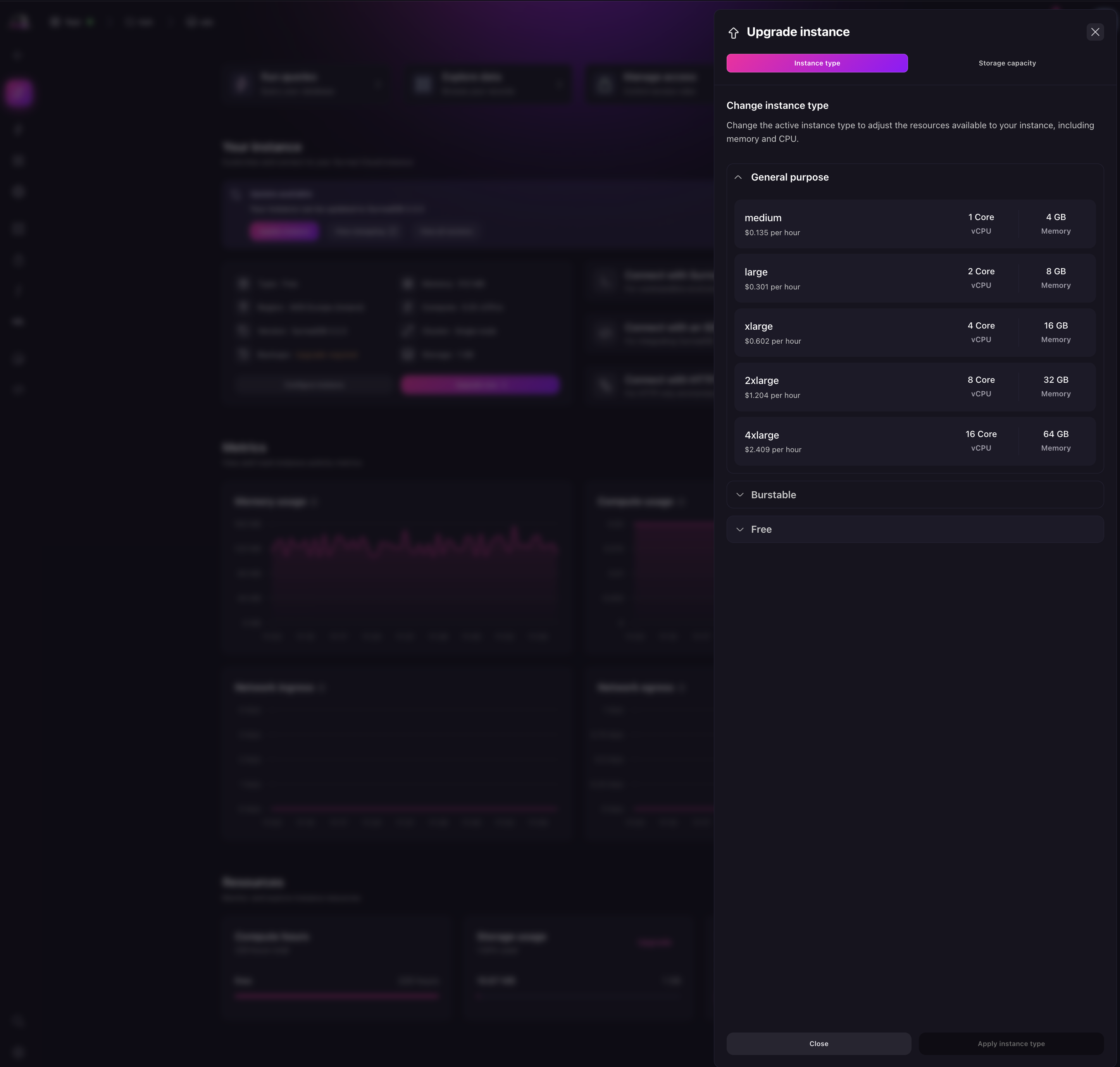 First, select the Instance type option which will open a modal to select the tier you want to upgrade to as shown below. Depending on the tier you choose, and the resources you have allocated, you will be billed accordingly.