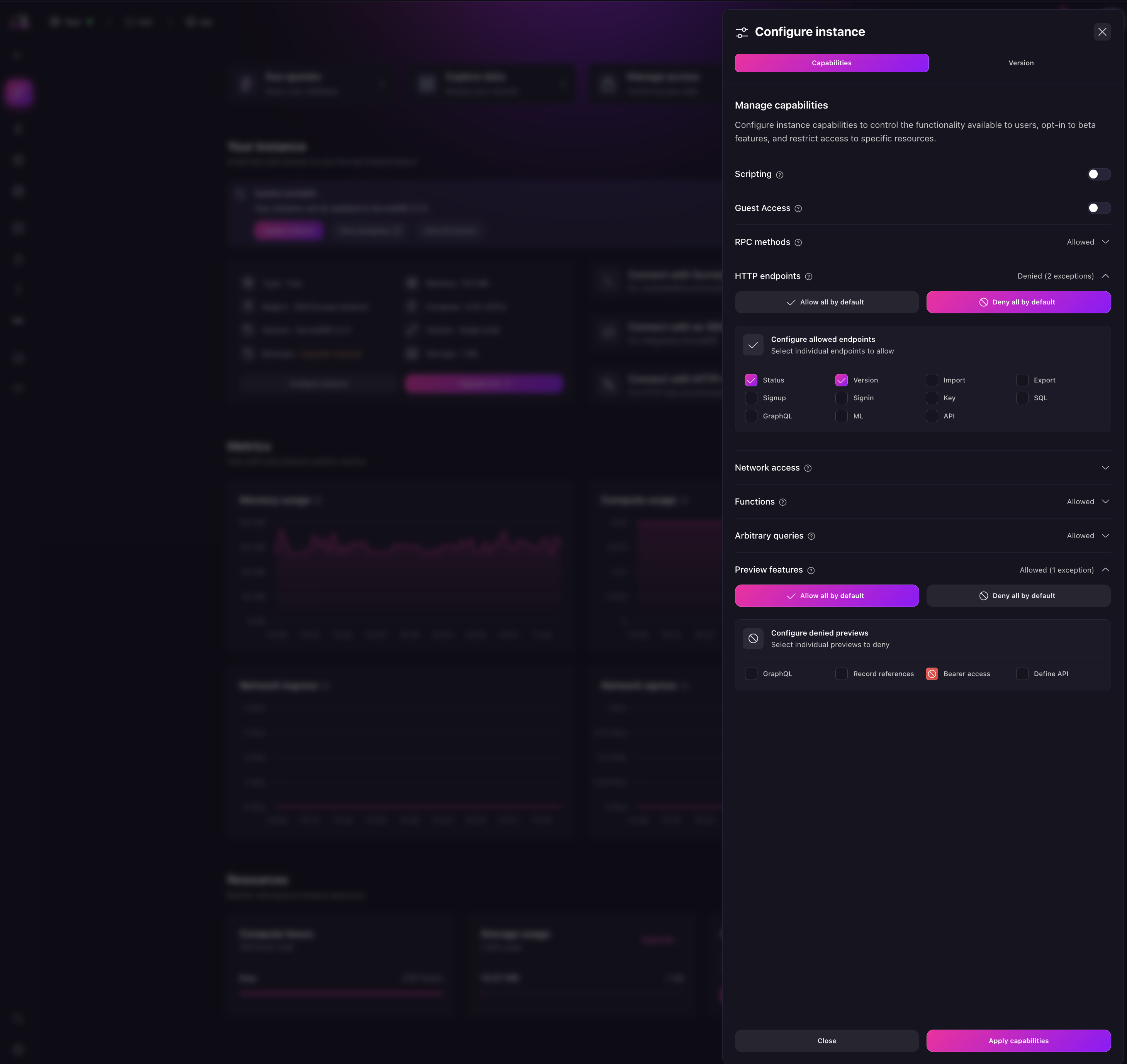 • Capabilities: the capabilities of the Instance, this controls the functionality available to users such as scripting, guest access, enabled endpoints for RPC and HTTP endpoints. You can also opt into beta features and restrict access to specific resources.