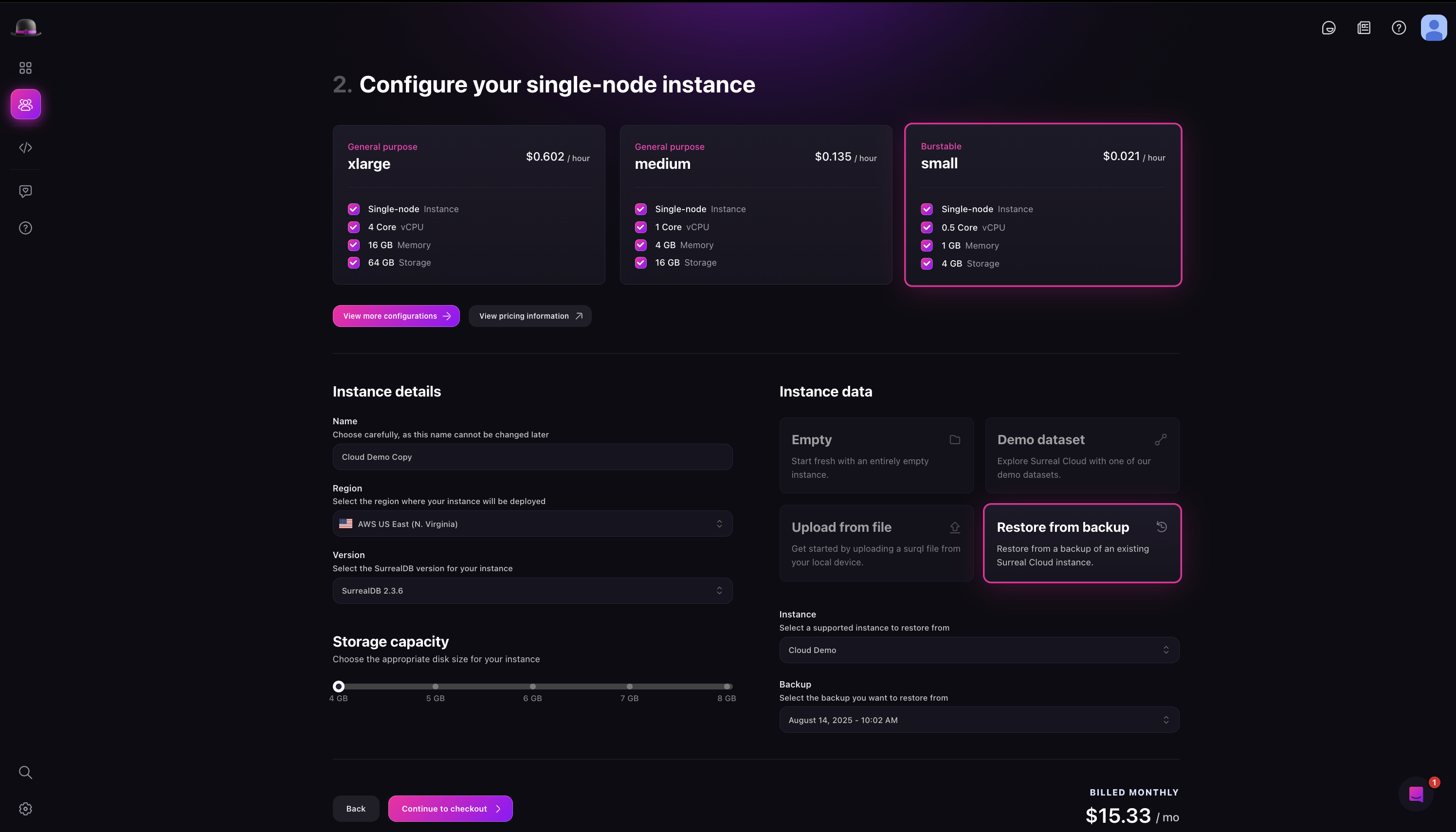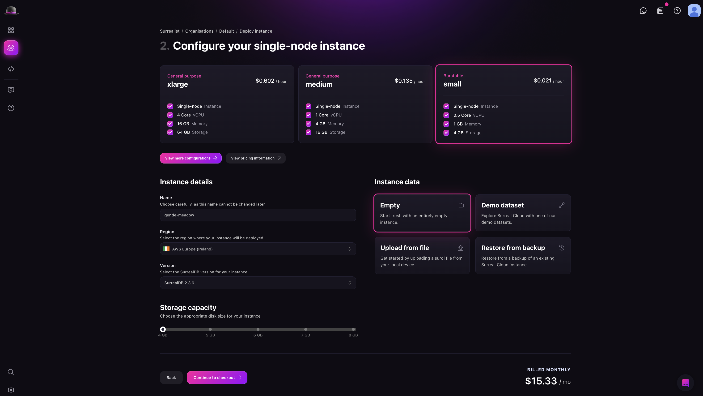 • SurrealDB version: the version of SurrealDB you want to use. Selecting the latest version is recommended but if you select a lower version, you will be able to upgrade to the latest in your Instance settings.