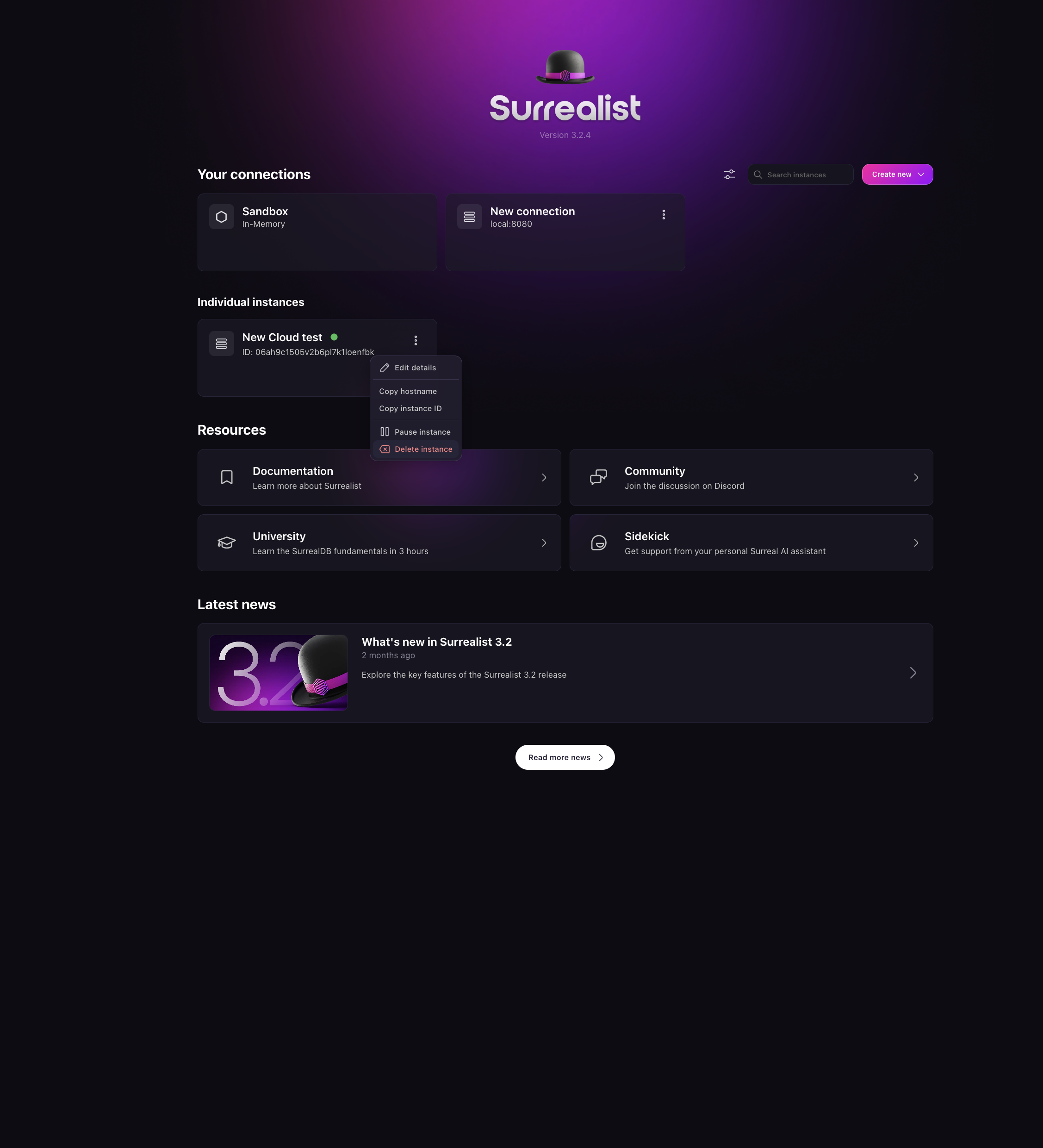 SurrealDB Cloud allows you to create a new Instance with a few clicks. You can create an Instance in your personal account or in an organization.