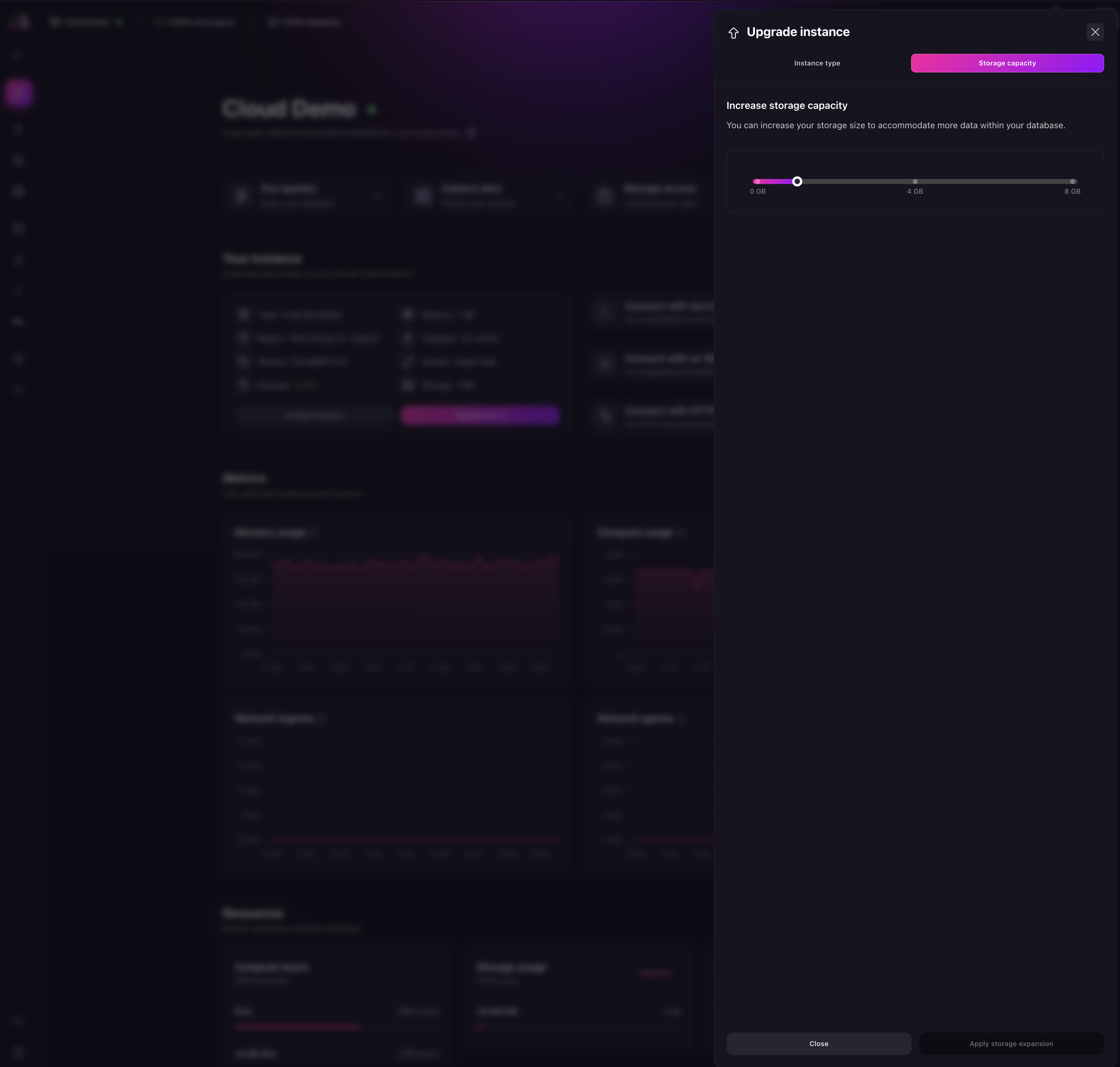 The storage capacity is the amount of storage available to your Instance. This is used to store the database files and can be increased at any time. For paid plans, you can increase the storage capacity up to the maximum limit of your plan.