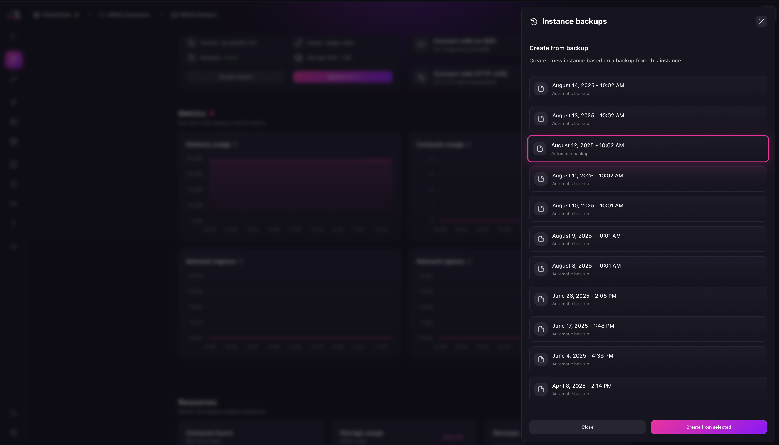In the resources section of the Instance dashboard, you can access the list of all your available backups. To restore from a backup, click the Create from selected button on the backup you want to restore from.